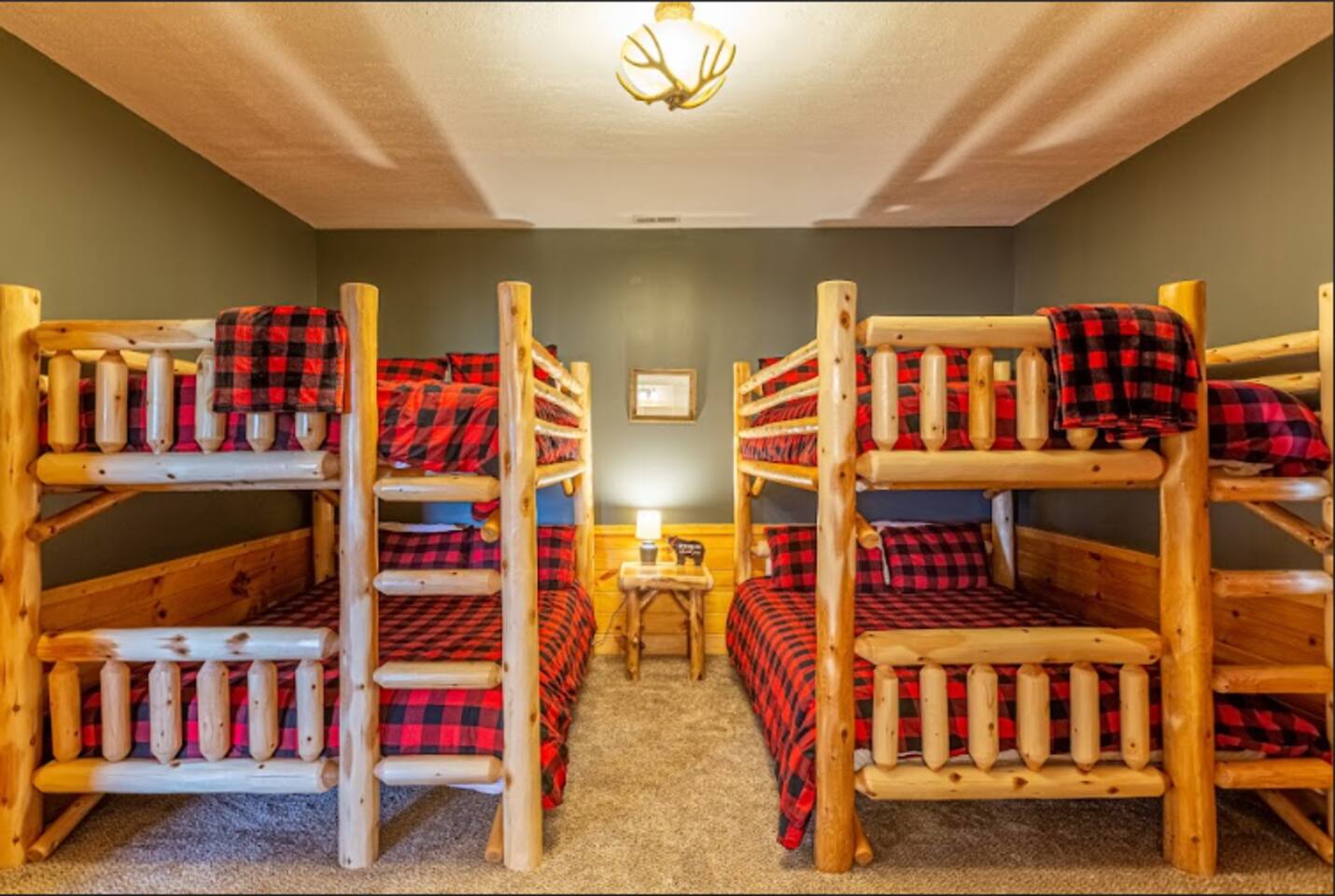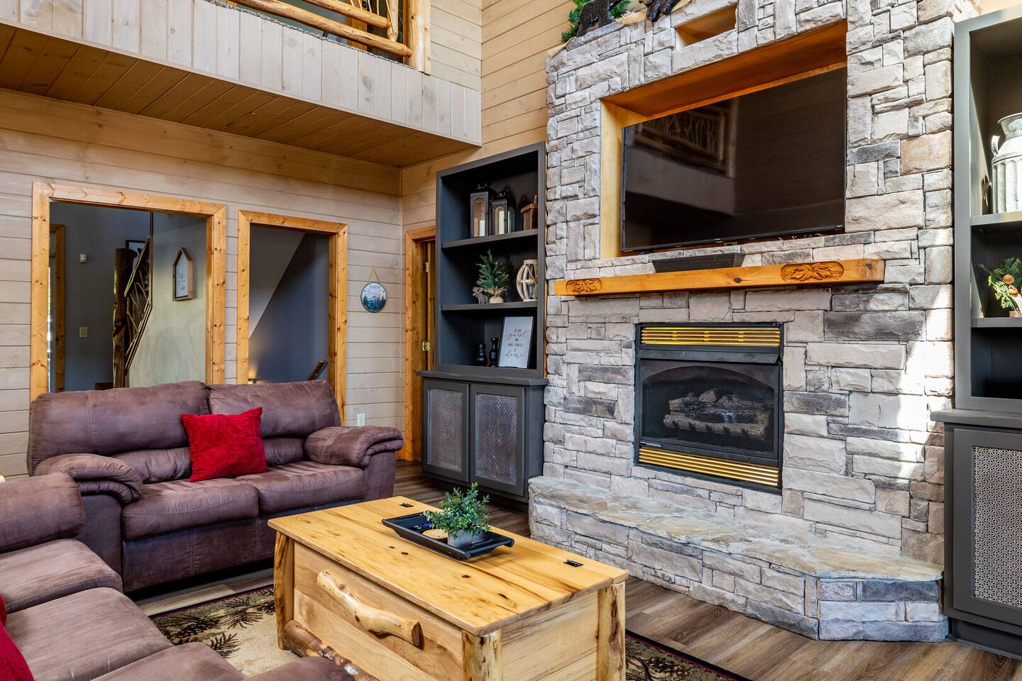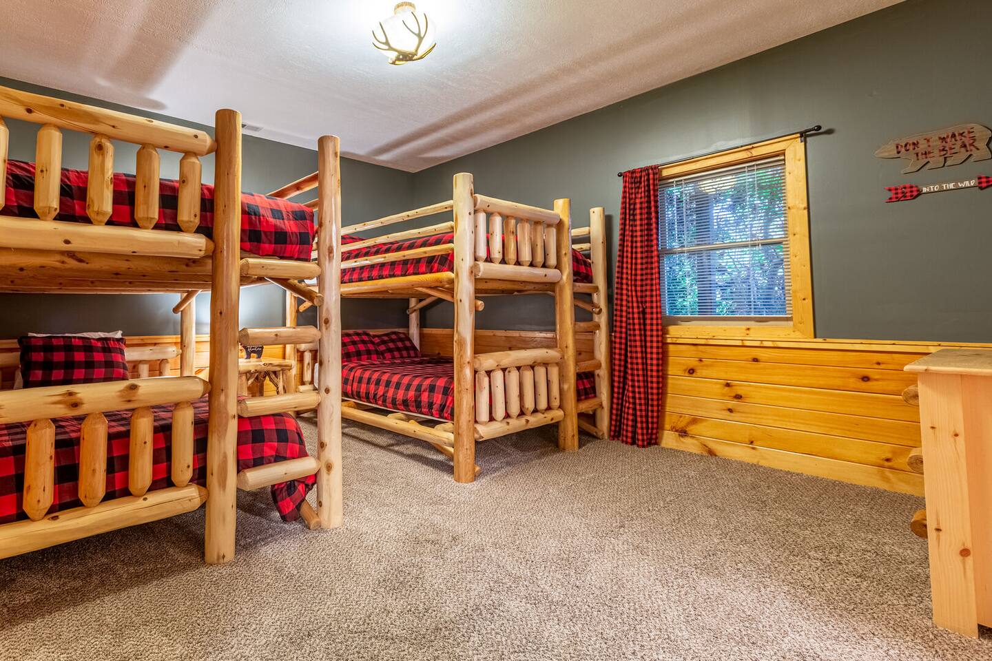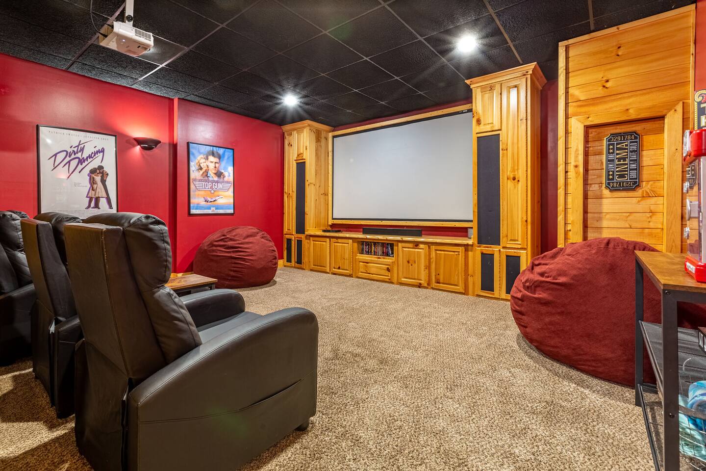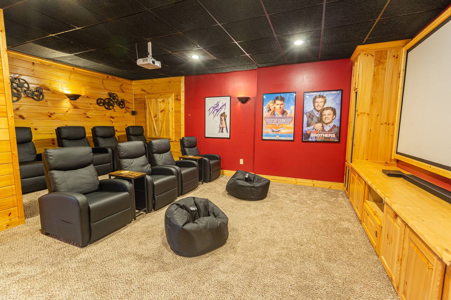 An incredible vacation awaits you and your entire crew, tucked away with world-class views of Mt. LeConte in the Smoky Mountains. Boasting a private waterfall pool, separate hot tub, loaded game room, and sprawling mountain view decks, plus a wrap-around porch. The younger set will love the queen-sized bunk beds (that’s 4 queens total!) and cozy kid’s nook with bean bag chairs and books. Gather everyone to the theater room to pop popcorn and watch movies on the big screen in plush recliners for 8. Get luxurious rest in the master with fireplace and walkout deck in the treetops. ** Big Bear Lodge got a facelift which included adding a new Hot Tub, Laundry Room, new deck & kitchen upgrades! The Big Bear Lodge is also an epic location for reunions and special events. Ask us how! Please note: This property comfortably accommodates 14 guests with traditional beds. Additionally, there are 2 bean bags that convert into full-size beds, bringing the total sleeping capacity to 16. KEY HOME FEATURES ✧ Pool will be closed for the winter from November-March, Hot Tub available year round ✧ NEW Starlink high speed WIFI ✧ Amazing mountain views - stunning Mt. Leconte vista ✧ Private outdoor pool with waterfall feature (non-heated) ✧ Hot Tub open year round ✧ Spacious sleeping accommodations for 14 ✧ Multiple sprawling decks for dining and relaxing with a view ✧ Screened-in deck and a wrap-around porch ✧ Spacious open floor plan with modern kitchen and fireplace ✧ Grandmaster bedroom with fireplace and deck ✧ Gameroom with foosball and the classic Ms. Pac-Man ✧Newly added Laundry Room ✧ AT&T and Verizon cell service and Roku for all TV's (Guest Mode). LOCATION 7 miles to Pigeon Forge 10 miles to Gatlinburg 12 miles to Smoky Mountain National Park BEDROOMS Count on quality linens and bedding provided for restful nights. Comfortably sleeps 14. Bedroom 1: 1 king bed Bedroom 2: 1 queen bed Bedroom 3: 1 full bed Bedroom 4: 2 queen-sized bunk beds - 4 queen beds total Common space: 2 Full size convertible bean bag beds BATHROOMS 3 full bathrooms and 1 half bath ADDITIONAL FEATURES ✧ Washer and dryer ✧ Fully stocked, open-concept kitchen ✧ Central heat and A/C ✧ Ask about our Military Discount ✧ Stairs lead to the entrance ✧ Pet Friendly - Ask us about our pet fees and limits (PET FEES ARE CHARGED SEPARATELY ONCE BOOKING IS CONFIRMED) Ask about our event space for large gatherings, family reunions, weddings, and more. We can combine everything this cabin has to offer with up to 3 other cabins in the area for once-in-a-lifetime experiences. (Events must be pre-approved.) Photo Disclaimer: Depending on your time of stay, the view may be different due to the natural growth of the trees. This is part of the appeal of being so close to the Great Smoky Mountains National Park.