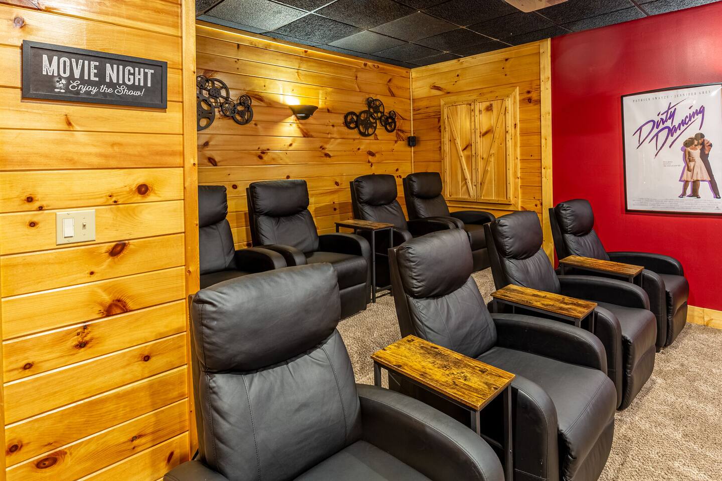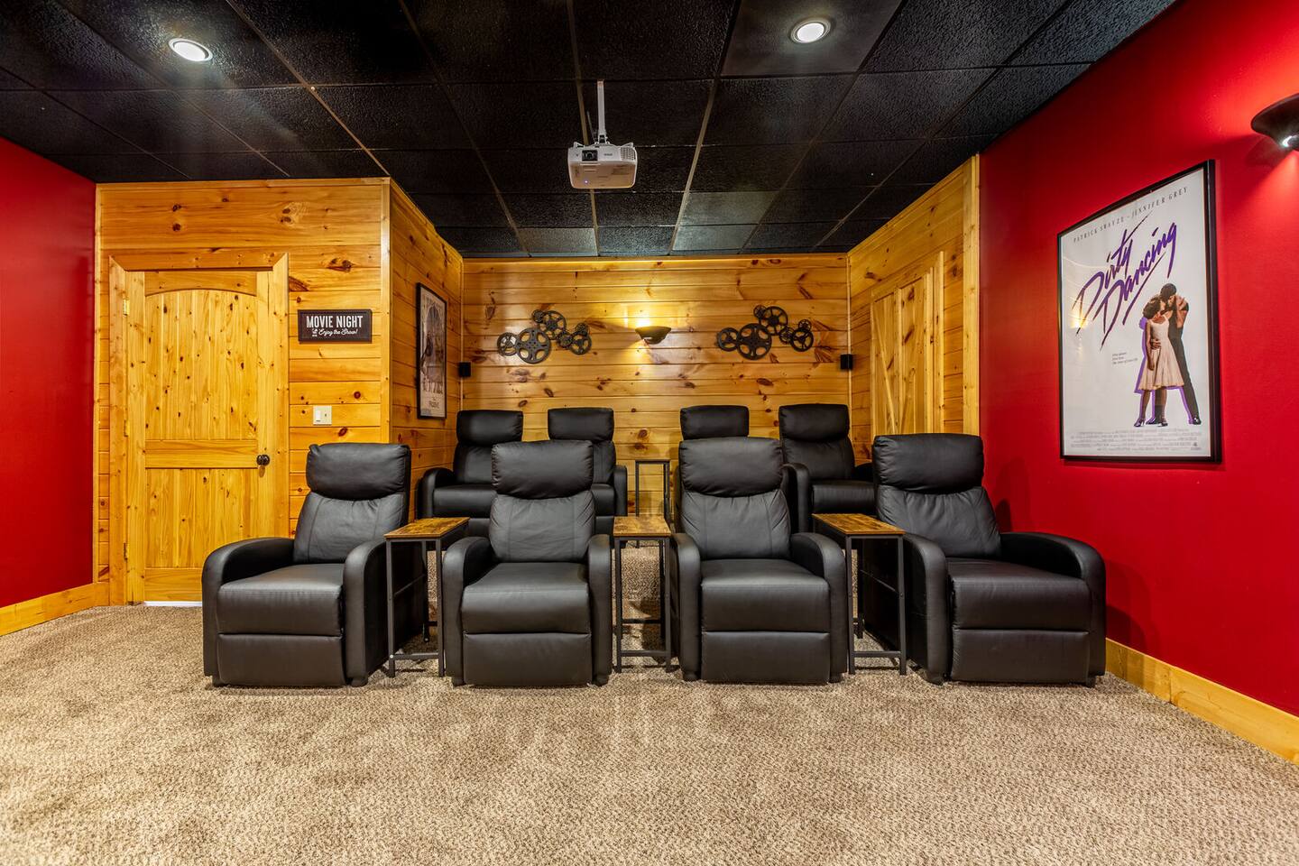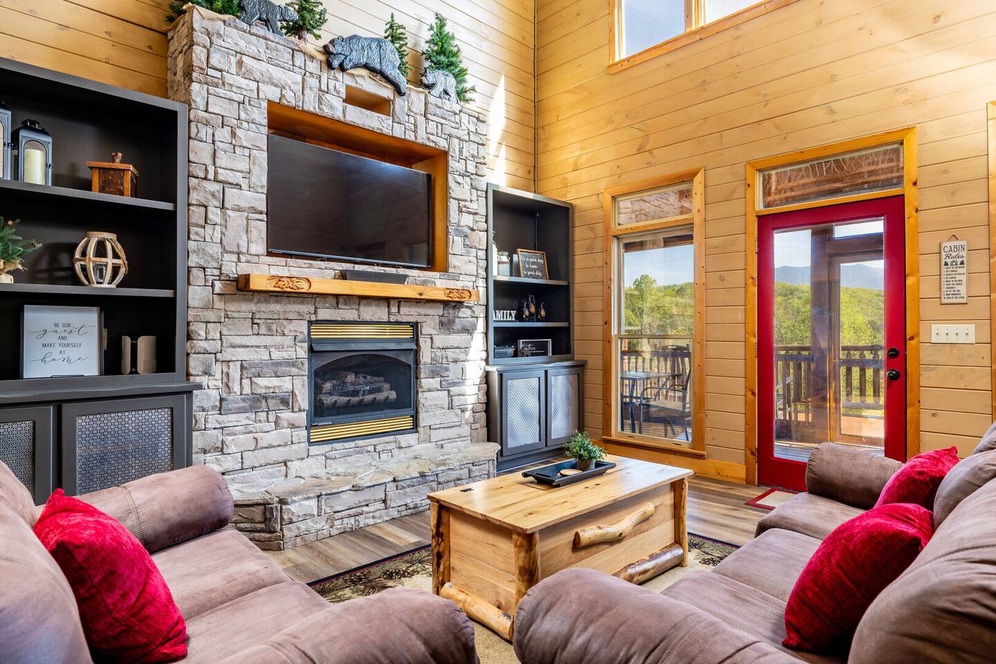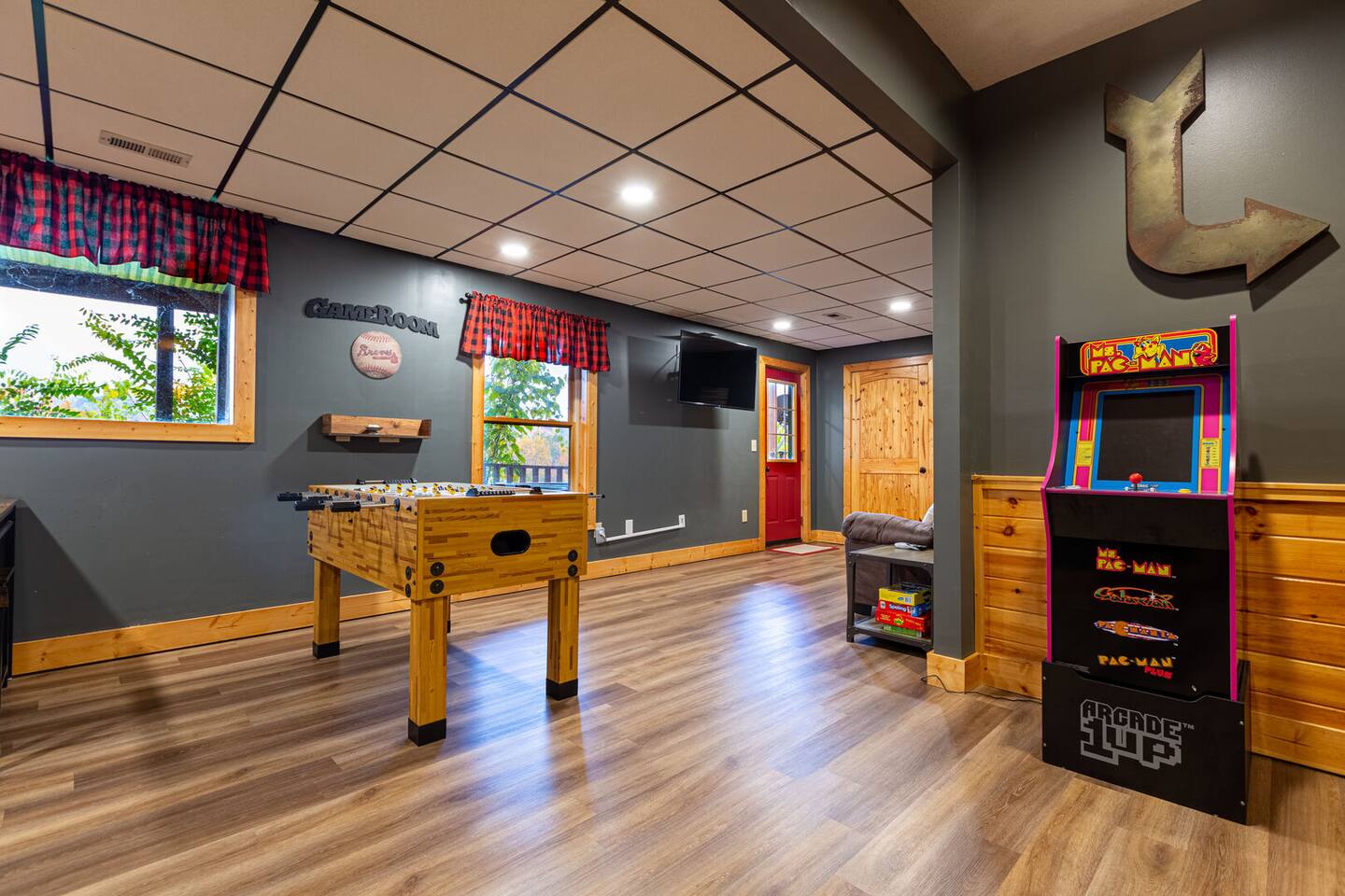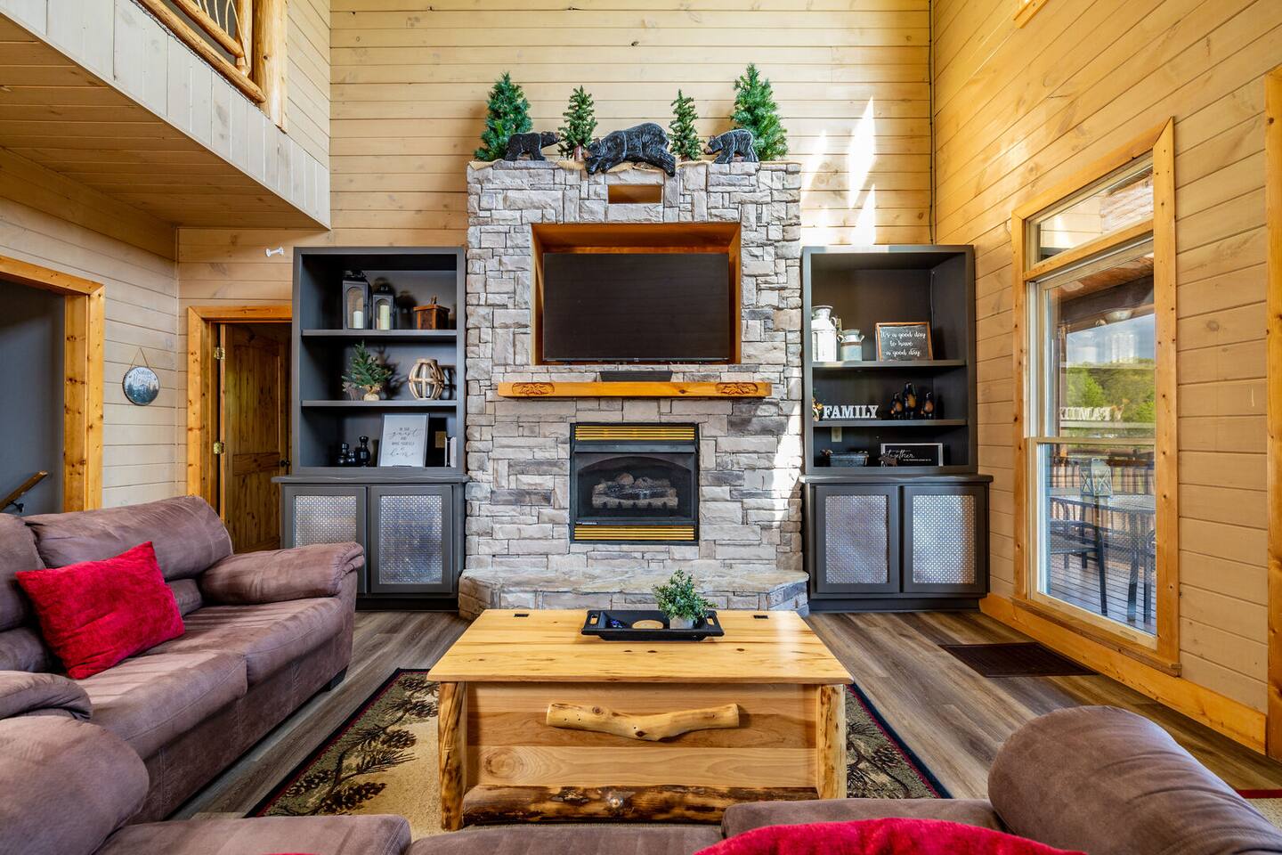 An incredible vacation awaits you and your entire crew, tucked away with world-class views of Mt. LeConte in the Smoky Mountains. Boasting a private waterfall pool, separate hot tub, loaded game room, and sprawling mountain view decks, plus a wrap-around porch. The younger set will love the queen-sized bunk beds (that’s 4 queens total!) and cozy kid’s nook with bean bag chairs and books. Gather everyone to the theater room to pop popcorn and watch movies on the big screen in plush recliners for 8. Get luxurious rest in the master with fireplace and walkout deck in the treetops. ** Big Bear Lodge got a facelift which included adding a new Hot Tub, Laundry Room, new deck & kitchen upgrades! The Big Bear Lodge is also an epic location for reunions and special events. Ask us how! Please note: This property comfortably accommodates 14 guests with traditional beds. Additionally, there are 2 bean bags that convert into full-size beds, bringing the total sleeping capacity to 16. KEY HOME FEATURES ✧ Pool will be closed for the winter from November-March, Hot Tub available year round ✧ NEW Starlink high speed WIFI ✧ Amazing mountain views - stunning Mt. Leconte vista ✧ Private outdoor pool with waterfall feature (non-heated) ✧ Hot Tub open year round ✧ Spacious sleeping accommodations for 14 ✧ Multiple sprawling decks for dining and relaxing with a view ✧ Screened-in deck and a wrap-around porch ✧ Spacious open floor plan with modern kitchen and fireplace ✧ Grandmaster bedroom with fireplace and deck ✧ Gameroom with foosball and the classic Ms. Pac-Man ✧Newly added Laundry Room ✧ AT&T and Verizon cell service and Roku for all TV's (Guest Mode). LOCATION 7 miles to Pigeon Forge 10 miles to Gatlinburg 12 miles to Smoky Mountain National Park BEDROOMS Count on quality linens and bedding provided for restful nights. Comfortably sleeps 14. Bedroom 1: 1 king bed Bedroom 2: 1 queen bed Bedroom 3: 1 full bed Bedroom 4: 2 queen-sized bunk beds - 4 queen beds total Common space: 2 Full size convertible bean bag beds BATHROOMS 3 full bathrooms and 1 half bath ADDITIONAL FEATURES ✧ Washer and dryer ✧ Fully stocked, open-concept kitchen ✧ Central heat and A/C ✧ Ask about our Military Discount ✧ Stairs lead to the entrance ✧ Pet Friendly - Ask us about our pet fees and limits (PET FEES ARE CHARGED SEPARATELY ONCE BOOKING IS CONFIRMED) Ask about our event space for large gatherings, family reunions, weddings, and more. We can combine everything this cabin has to offer with up to 3 other cabins in the area for once-in-a-lifetime experiences. (Events must be pre-approved.) Photo Disclaimer: Depending on your time of stay, the view may be different due to the natural growth of the trees. This is part of the appeal of being so close to the Great Smoky Mountains National Park.