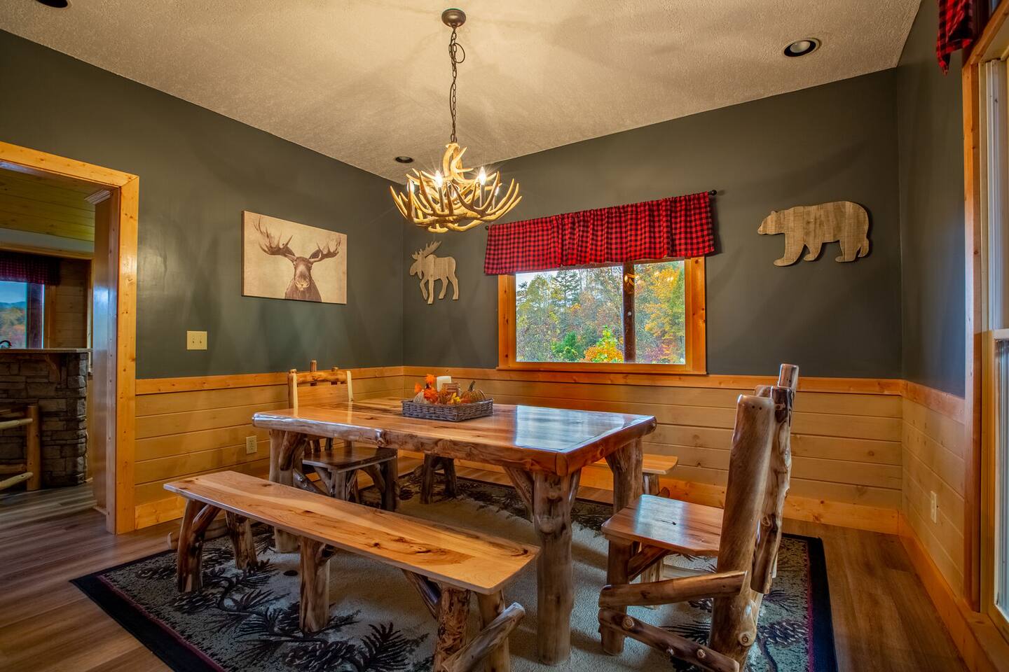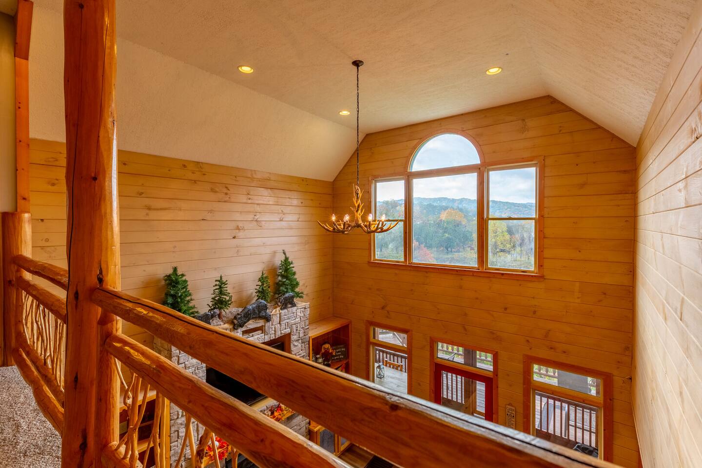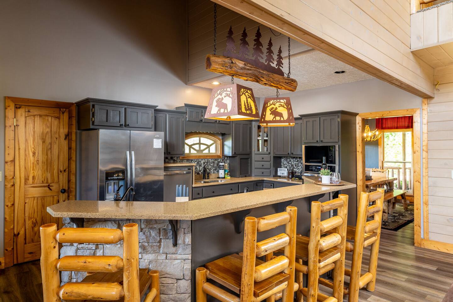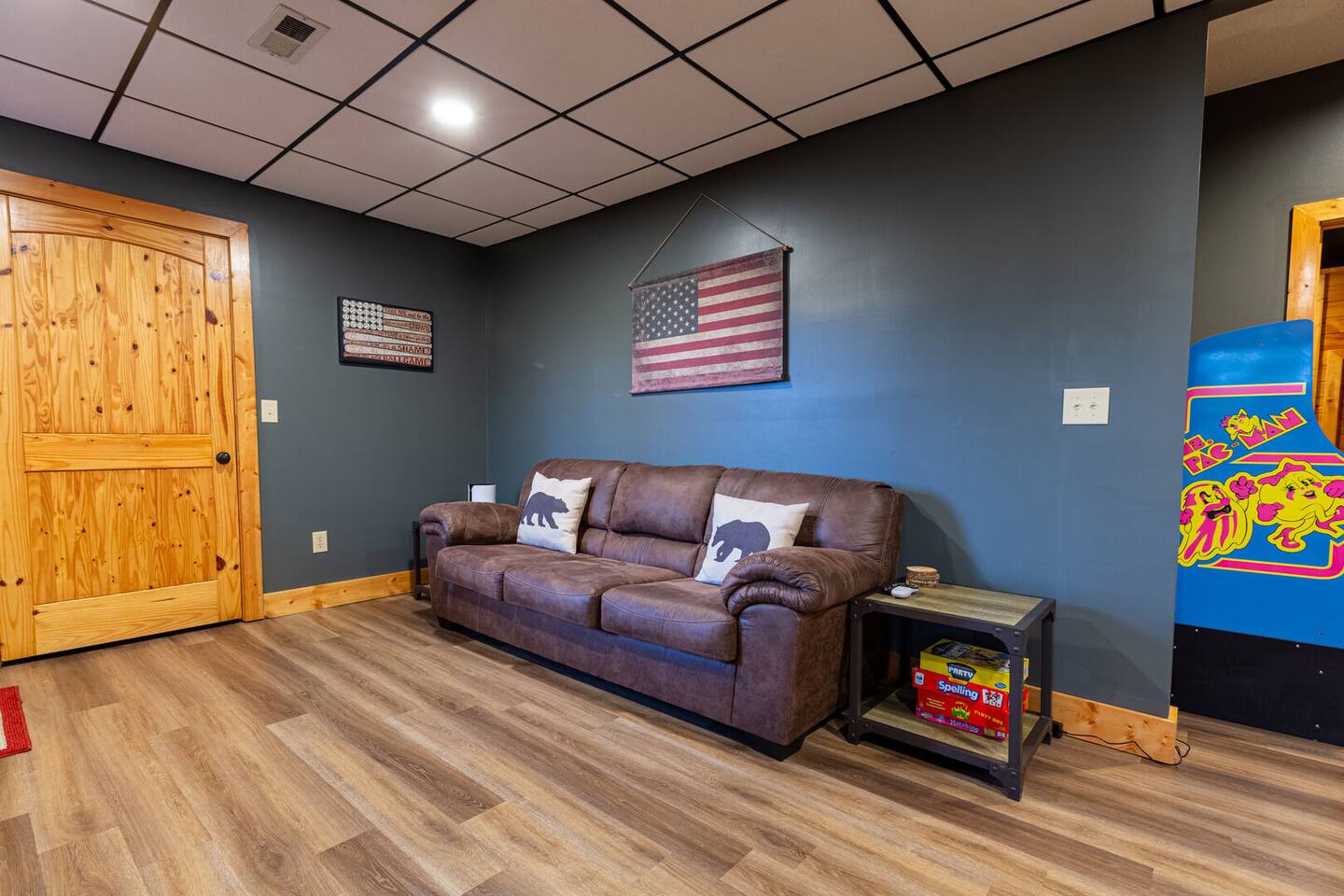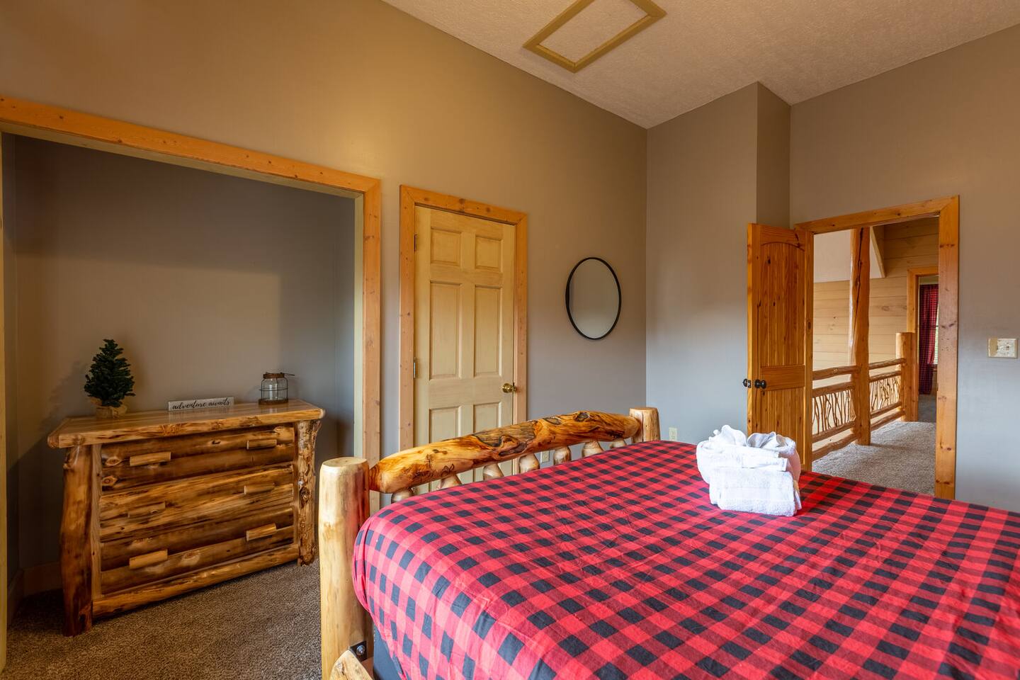 An incredible vacation awaits you and your entire crew, tucked away with world-class views of Mt. LeConte in the Smoky Mountains. Boasting a private waterfall pool, separate hot tub, loaded game room, and sprawling mountain view decks, plus a wrap-around porch. The younger set will love the queen-sized bunk beds (that’s 4 queens total!) and cozy kid’s nook with bean bag chairs and books. Gather everyone to the theater room to pop popcorn and watch movies on the big screen in plush recliners for 8. Get luxurious rest in the master with fireplace and walkout deck in the treetops. ** Big Bear Lodge got a facelift which included adding a new Hot Tub, Laundry Room, new deck & kitchen upgrades! The Big Bear Lodge is also an epic location for reunions and special events. Ask us how! Please note: This property comfortably accommodates 14 guests with traditional beds. Additionally, there are 2 bean bags that convert into full-size beds, bringing the total sleeping capacity to 16. KEY HOME FEATURES ✧ Pool will be closed for the winter from November-March, Hot Tub available year round ✧ NEW Starlink high speed WIFI ✧ Amazing mountain views - stunning Mt. Leconte vista ✧ Private outdoor pool with waterfall feature (non-heated) ✧ Hot Tub open year round ✧ Spacious sleeping accommodations for 14 ✧ Multiple sprawling decks for dining and relaxing with a view ✧ Screened-in deck and a wrap-around porch ✧ Spacious open floor plan with modern kitchen and fireplace ✧ Grandmaster bedroom with fireplace and deck ✧ Gameroom with foosball and the classic Ms. Pac-Man ✧Newly added Laundry Room ✧ AT&T and Verizon cell service and Roku for all TV's (Guest Mode). LOCATION 7 miles to Pigeon Forge 10 miles to Gatlinburg 12 miles to Smoky Mountain National Park BEDROOMS Count on quality linens and bedding provided for restful nights. Comfortably sleeps 14. Bedroom 1: 1 king bed Bedroom 2: 1 queen bed Bedroom 3: 1 full bed Bedroom 4: 2 queen-sized bunk beds - 4 queen beds total Common space: 2 Full size convertible bean bag beds BATHROOMS 3 full bathrooms and 1 half bath ADDITIONAL FEATURES ✧ Washer and dryer ✧ Fully stocked, open-concept kitchen ✧ Central heat and A/C ✧ Ask about our Military Discount ✧ Stairs lead to the entrance ✧ Pet Friendly - Ask us about our pet fees and limits (PET FEES ARE CHARGED SEPARATELY ONCE BOOKING IS CONFIRMED) Ask about our event space for large gatherings, family reunions, weddings, and more. We can combine everything this cabin has to offer with up to 3 other cabins in the area for once-in-a-lifetime experiences. (Events must be pre-approved.) Photo Disclaimer: Depending on your time of stay, the view may be different due to the natural growth of the trees. This is part of the appeal of being so close to the Great Smoky Mountains National Park.